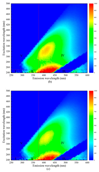 In order to verify this conclusion, three-dimensional fluorescence spectroscopy was used to determine the change law of organic components in water samples before and after combined disinfection. The results are shown in Figure 5. The peak value of the three-dimensional fluorescence spectrum at an excitation wavelength of 250~280 nm and emission wavelength < 380 nm were related to soluble microbial metabolites (Region IV). The peak at excitation wavelength > 280 nm and emission wavelength > 380 nm was related to humic acids (Region V). Therefore, the fluorescence intensity value in the figure was used to infer the content of the substance in the water sample to explore the change law of each organic component before and after disinfection [26,27]. The experimental results in Figure 5 show that in the combined mode when “Method B” was adopted, the fluorescence intensity in Area IV and V was significantly lower than that in raw water. This showed that the water sample had dissolved microbial metabolites, and humic acids were oxidized and decomposed and lost their fluorescence, significantly reducing these two organic components. Under the condition of “Method A”, the reduction of dissolved microbial metabolites and humic acids was considerably weaker than simultaneous disinfection with ultraviolet and sodium hypochlorite, which allowed more oxidants to participate in the disinfection process and improve the disinfection efficiency [28].