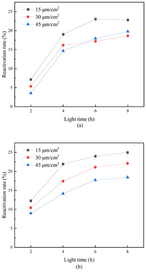 Figure 6 shows the effect of different illumination times and light intensity on the photoactivation of fecal coliform. It can be seen from Figure 6 that the reactivation rate of fecal coliforms in water samples after combined disinfection increased with the extension of light time. However, when the light time increased to 8 h, the reactivation rate of fecal coliforms in “Method A” and “Method B” under different reactivation light intensities gradually tended to the same level. This indicated that the light intensity affected the reactivation rate of fecal coliform at the initial stage of light exposure but did not significantly improve its reactivation degree. This is consistent with the research results of Guo M.T. et al. [29]. They found in the experiment that when the light time was 2 h, the larger the light intensity was, the faster the average resurrection rate of E. coli was. However, with the light reactivation time reaching 8 h, E. coli had reached the same maximum value of reactivation under different light intensities. In addition, it can be seen from the figure that the reactivation rate of fecal coliforms also increased with the enhancement of the reactivation light intensity. Under the conditions of 8 h of light revival time and 15, 30, and 45 μm/cm2 of revival light intensity, the revival rates of fecal coliforms in “Method A” were 16.88%, 21.09%, and 26.96%, respectively. This showed that the stronger the reactivation light intensity, the greater the energy provided to the damaged bacteria for light reactivation, and the stronger the corresponding light reactivation ability. In “Method B”, when the reactivation light intensity was 15 and 30 μm/cm2, there was little difference in the reactivation rate of fecal coliforms, which were 25.8% and 24.64%, respectively. With the increase of light intensity to 45 μm/cm2, the reactivation rate increased to 30.81%. The comparison results showed that the reactivation rate of fecal coliforms disinfected by “Method B” was higher than that of “Method A”. This may be due to more significant damage to the fecal coliform group caused by UV disinfection and sodium hypochlorite disinfection, resulting in most microorganisms losing the repair function of DNA dimer. Thus, effectively inhibiting the occurrence of microbial photoreactivation and ensuring the safety and stability of microbial indicators in the effluent.