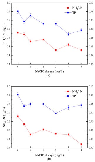 Removal effect of combined disinfection on NH4+-N and TP. (a) “Method A”; (b) “Method B”.