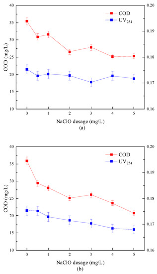Buchanan W. et al. [35] pointed out that the oxidative degradation of organic matter by sodium hypochlorite and the decomposition of some small molecular organic matter by ultraviolet energy only changed the structure of organic matter and could not mineralize organic matter into CO2 and completely remove it from the water body. However, Wang C. et al. [36] found in the study that, when UV and sodium hypochlorite were applied at the same time, due to the strong free radical activity produced by the advanced oxidation process, the macromolecular organic matter with a complex structure gradually decomposed into small molecular acids and finally transformed into CO2 and discharged into the water body.