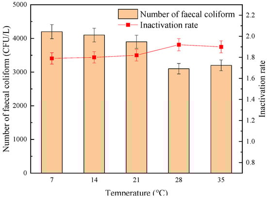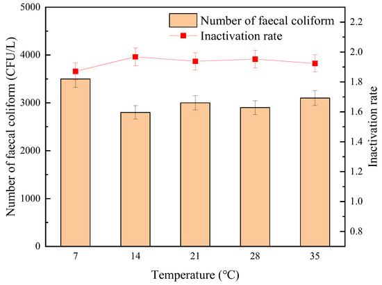 The influence of temperature on the sterilization effect of “Method A” and “Method B” is shown in Figure 10 and Figure 11, respectively. It can be seen from Figure 10 and Figure 11 that under the same UV dose, sodium hypochlorite dosage, and contact reaction time conditions, the inactivation effect of “Method A” on fecal coliform was basically not affected by the temperature change. As the water temperature increased from 7 °C to 35 °C, the measured number of fecal coliform in effluent decreased from 3.5 × 103 CFU/L to 3.1 × 103 CFU/L, and the logarithmic inactivation rate remained stable above 1.8-lg. On the contrary, when using “Method B”, in rising water temperature, the number of fecal coliforms decreased from 4.2 × 103 CFU/L to 3.2 × 103 CFU/L, and the changing trend of the logarithmic inactivation rate was not as stable as that of “Method A”. In general, under the same temperature trend, the inactivation effect of “Method A” was always better than that of “Method B”, and the inactivation effect was the best when the temperature was in the range of 14–28 °C.