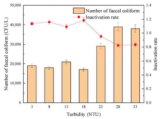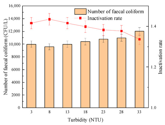 Figure 12 and Figure 13 show the effect of turbidity on the sterilization effect of “Method A” and “Method B”, respectively. The experimental results showed that in the process of increasing turbidity, when “Method A” was adopted, the number of fecal coliforms in effluent increased slowly, and the logarithmic inactivation rate decreased but remained at about 1.4-lg. When using “Method B”, the logarithmic inactivation rate of fecal coliform did not change significantly when the turbidity was ≤ 18 NTU and remained at about 1.18-lg. When the turbidity was greater than 18 NTU, the number of fecal coliform bacteria increased significantly, and the logarithmic inactivation rate decreased to 0.84-lg when the turbidity increased to 33 NTU. However, the influence of turbidity on its germicidal effect was significantly weaker than that of single group UV disinfection. The results showed that the combined disinfection method weakened the influence of turbidity on the inactivation effect of fecal coliform bacteria and improved the safety of effluent microbial indicators.