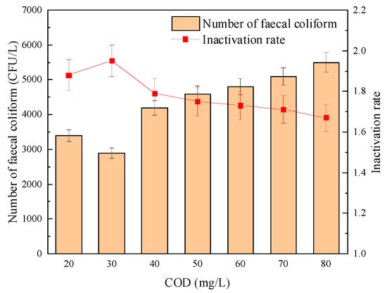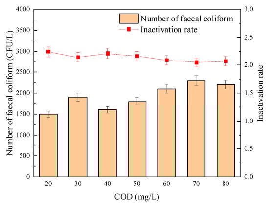 The influence of COD load on the sterilization effect of “Method A” and “Method B” is shown in Figure 14 and Figure 15, respectively. It can be seen from Figure 14 and Figure 15 that the inactivation effect of combined disinfection on the fecal coliform group showed an inevitable downward trend with the continuous increase of COD load. Among them, the logarithmic inactivation rate of fecal coliform reached more than 2.0-lg when the disinfection method of “Method A” was adopted. However, when “Method B” was adopted, the changing trend of the logarithmic inactivation rate of fecal coliform was less stable than that of “Method A”. For example, when the COD load increased from 20 mg/L to 80 mg/L, the logarithmic inactivation rate decreased from 1.79-lg to 1.67-lg.
