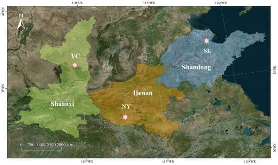 We selected the uncontaminated soil around three typical oilfields in northern China (Shengli Oilfield, Nanyang Oilfield and Yanchang Oilfield). The Shengli Oilfield is located in the Yellow River delta area of Dongying City, Shandong Province, with geographical coordinates of 37°23′ N and 118°31′ E. The Nanyang Oilfield is located in Nanyang City, southwest of Henan Province, with geographic coordinates of 32°41′ N and 112°34′ E. The Yanchang Oilfield is located in Yan’an City, northern Shaanxi Province; the landforms are mainly the Loess Plateau and hilly areas, and the geographical coordinates are 36°40′ N and 109°33′ E. We measured the content of PHE in the sampled soil, and found no accumulation of PHE in these uncontaminated soils. The three soils were named SL, NY and YC, respectively. The geographical location of the three sampled oilfields is shown in Figure 1.