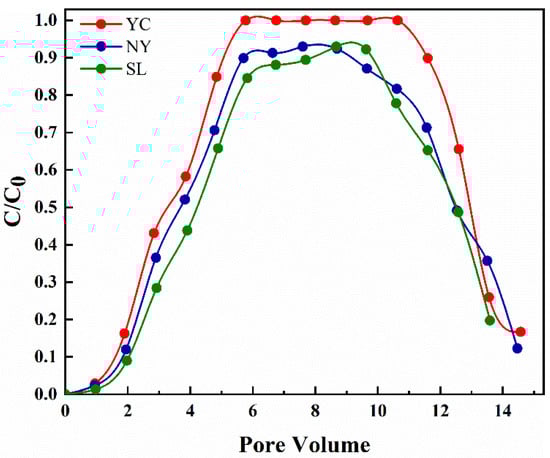 As can be seen from Figure 2, the penetration curve of PHE (expressed as C/C0) in different soil types showed a rapid upward trend at first, then entered a stable period when the pore volume was about 6, and finally decreased rapidly after the pore volume was 10. The initial growth rate of C/C0 from fast to slow is YC, NY and SL, respectively. After the plateau period, the decline rate from fast to slow was also YC, NY and SL. It can be seen that the penetration effect of YC was the best, with the highest permeability of 1.00; that is, YC can completely penetrate the soil column. Followed by NY, the C/C0 value of the stable period was 0.93. A little worse than NY was SL, whose permeability C/C0 was basically around 0.9. It is speculated that this may be due to the differences of soil composition and physical and chemical properties in different areas. During the process of migration of pollutants such as PAHs, different physical and chemical conditions in soil will inevitably produce different migration results [,].