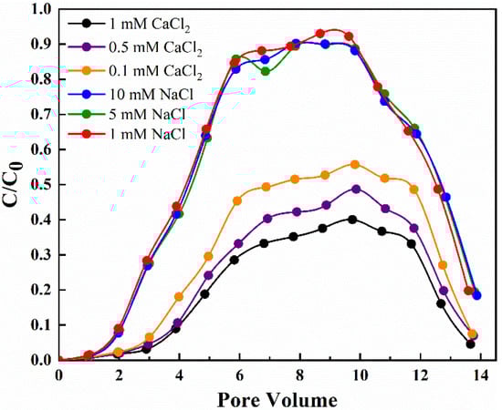 The penetration curves of PHE under different conditions of IS are shown in Figure 3. It can be seen that the migration and dissolution rate of PHE in the soil decreased with the increase of IS, which leads to the widening and delay of the penetration curve. This was consistent with the results of previous studies [,]. It could be that the increase in IS leads to the formation of more cations and anions in solution, which compresses the soil particles []. Therefore, electrostatic electric double layer particles reduce the repulsion of soil particles. Moreover, the increase of metal ions will adsorb and deposit a certain amount of PHE, which will enhance its migration resistance. In the presence of the two selected electrolyte solutions, it can be clearly seen that the ability of NaCl to promote PHE migration was significantly stronger than that of CaCl2. Different concentrations of NaCl (1 mM, 5 mM, 10 mM) had little effect on the migration of PHE, but the highest migration of PHE was observed under the electrolyte solution with 1 mM NaCl, up to 93%. However, under the action of CaCl2, its promotion effect was weaker. It can be found that when the concentration of CaCl2 was between 0 and 1 mM, the lower the electrolyte concentration, the higher the degree of PHE migration.