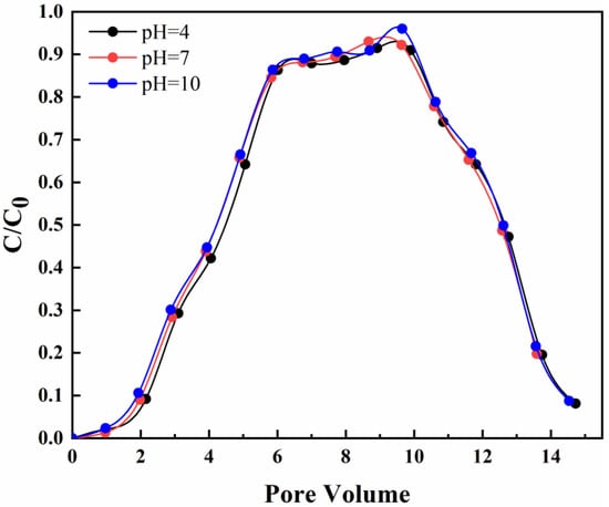 It is inferred that the transport of PHE in soil had no significant correlation with the change of pH (see in Figure 4). Liu measured the penetration curves of soil colloids under different pH values (5, 7 and 9) and 30 mM NaCl solution, and found that the penetration curves basically overlapped between pH values 7 and 9 []. According to present studies, PHE is a highly non-ionizable hydrophobic organic chemical that can maintain a high degree of hydrophobicity across all pH settings. As a result, changes in the pH value had no clear influence on the migration of PHE in saturated sand columns [,], so the speciation of PHE does not change with the decrease of pH value, and there was no obvious difference between the penetration curves of PHE. The chemical stability of PHE will not be affected by the difference of pH values. From this experiment, it can be concluded that the pH value has no significant influence on the vertical migration of PHE in soil. According to experimental results, the neutral conditions of PHE were used in the subsequent experiments to explore the influence of other soil conditions.