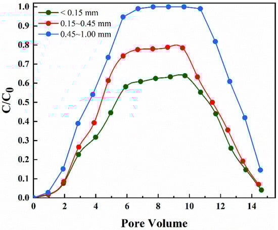 The penetration curves of PHE in soils with different particle sizes are shown in Figure 5. Within the pore volume range of 1~15, there was a peak in the penetration curves of the three particle sizes, which indicated that PHE can completely (0.45~1 mm) or partially (0~0.15 mm and 0.15~0.45 mm) pass through the leaching process of soil column. Additionally, the penetration curve with a particle size of 0.45~1 mm appeared to have a stable peak value of 1.00.