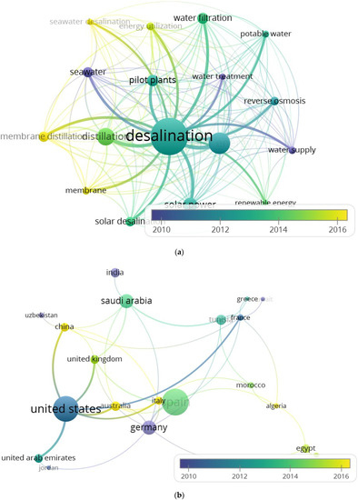 In the next step, with the application of the VOS viewer software and Scopus databank, the “desalination”, “solar”, and “pilot” keyword are evaluated as per their keyword occurrence and country distribution, as demonstrated in Figure 1. As per the mentioned scheme (Figure 1), it can be found that the optimization of the physical specifications of the solar-based desalination system is not reflected; however, this gap will be filled by the present study. Additionally, the issue is more popular in the USA and Spain than in other countries, and Iran is considered an important region in this field.