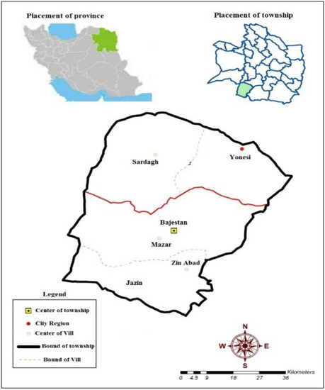 The Bajestan Plain is one of the driest regions in Razavi Khorasan province, located in the northeast of Iran, a country in the Middle East. This plain is located near a desert, which investigations have shown to be the source of saline waters infiltrating into the plain and making its groundwater resources brackish. As a result of this process, significant increases have been observed in the total dissolved solids (TDS) and electrical conductivity (EC) of the northern wells of this area (which, despite the brackishness, are still being used in agriculture). Considering the described trend of the salinization of the groundwater resources of the Bajestan Plain, this study was carried out based on the geography and qualitative requirements in the area of Razavi Khorasan province in Iran. The location of the case study is shown in Figure 2.