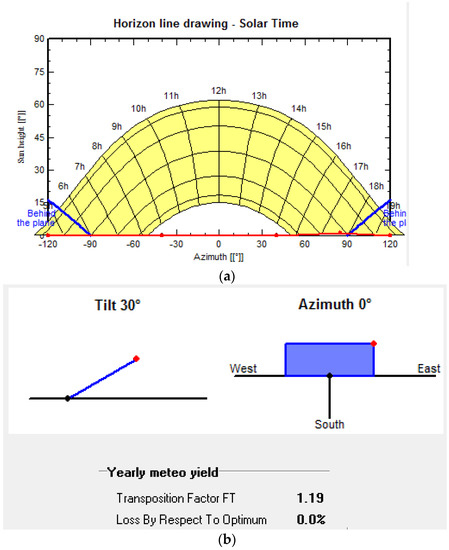 Modeling in PVSyst software has been used to determine the exact mechanism of the solar-energy-receiving potential. According to the calculations, the studied area has solar potential, as shown in Figure 4a. Meanwhile, according to Figure 4b, it can be seen that at 30 degrees, the amount of energy loss and the transposition factor index are in the most optimal possible state. This simulation result is confirmed by the case study results and the research background [15].