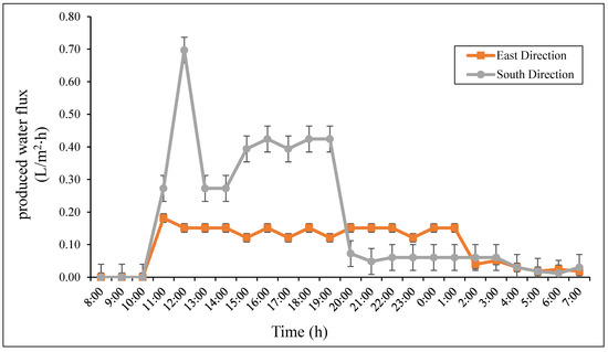 At the beginning of the tests, the researchers investigated the performance of the solar distillation unit when placed facing the northward and westward directions, but given the observed dismal efficiency, further investigations were restricted to the southward and eastward directions. The average hourly flux of water produced over a 7-day period per square meter of transparent glass by the units placed facing the east and south directions are presented in Figure 5. Note that in these tests, the weather was sunny, the pool depth was 5 cm, and the input salinity level was 11,000 mg/L.