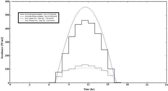 Again, due to evaluation of the system performances at different times of day, a PVSyst simulation was performed, as illustrated in Figure 7. According to the mentioned Figure 7, it is clear that after 13:00, the received solar irradiance was reduced, meaning the performance of the system was abridged. However, in the experiments, there were some uncontrollable features such as noise. Meanwhile, the simulation outputs can confirm the experimental results and can help with increasing the certainty of the empirical outputs.