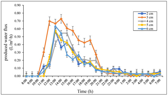 The depth of water inside the evaporation pool plays a key role in how well a solar technology operates. This pool should be deep enough to hold enough water for evaporation, but not so deep that it would undermine the heating process. Given that the pool depth in the initial tests was 5 cm, the unit performance in the southward orientation was remeasured with the pool depths set to 2, 3, 4, 5, and 6 cm. Figure 8 shows the trends of freshwater production for different pool depths. For all pool depths, water production was almost zero in the first hours and reached a maximum between 12:00 and 16:00. The results also showed that the highest freshwater production rate, 5.48 L/m2·day, was achieved with a pool depth of 3 cm. The next highest freshwater production rates were 3.24, 3.10, 3.06, and 2.94 L/m2·day, which were achieved with the pool depths of 4, 5, 2, and 6 cm, respectively. In these tests, the highest hourly freshwater production rate was 0.73 L/m2·h, which was achieved with a pool depth of 3 cm at 14:00.