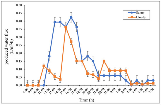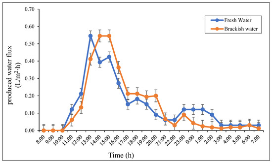 In this section, we discuss how the unit desalinates brackish water (with a salinity of 11,000 mg/L) and relatively freshwater (with a salinity of 1000 mg/L). In these tests, the unit was placed facing southward, the pool depth was 3 cm, and the weather condition was sunny. The mean freshwater production fluxes achieved with high and low salinity levels were respectively 3.27 and 3.24 L/m2·day, which indicated that the system’s performance does not significantly depend on this variable. The highest hourly freshwater production rate achieved with both high and low input salinity levels was 0.55 L/m2·h, which was observed at 14:00–15:00 and 13:00, respectively, as shown in Figure 10.