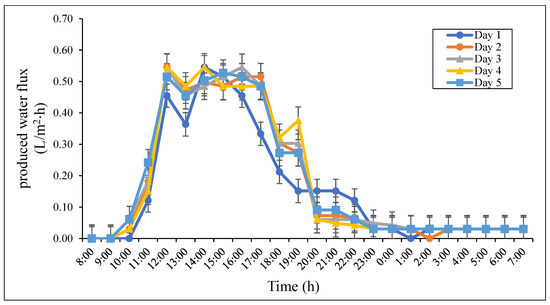 One of the most important parameters of desalination with solar stills is whether water is introduced into the unit continuously or in batches. To investigate the effect of this variable, a test was performed to determine what happens if the unit is left to function continuously for 5 days. This test showed a discontinuity in the hourly freshwater production rates during the first day of operation, which may have been due to temperature differences in different parts of the unit (Figure 11). Over time, however, it can be observed that an increase in the water production flux occurred, as well as an increase in continuity of the hourly production. The production fluxes recorded on the first to fifth days were respectively 3.82, 4.27, 4.36, 4.33, and 4.36 L/m2·day. The findings show that from the third day onwards, the freshwater production reached a steady state.
