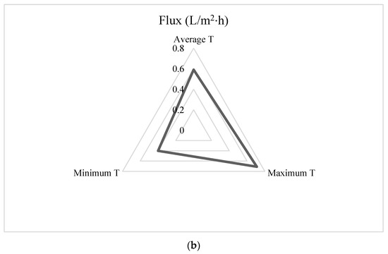 In the following phase, the pilot study was set to optimum conditions (unit orientation, water pool depth, atmospheric conditions, and water flow continuity) and the effects of the different temperatures (maximum, minimum and average temperatures) were appraised. The different assessed temperatures and output fluxes under optimum conditions are demonstrated in Figure 12a,b.