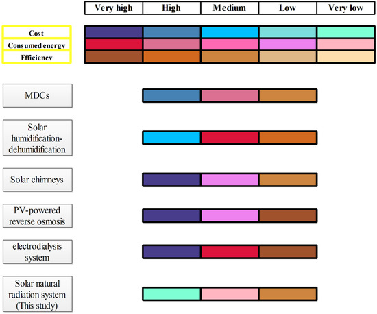 As a conclusion, a comparison of different desalination methods is demonstrated in Figure 13. Based on the declared scheme, it can be seen that each method has specific advantages and disadvantages, which can be utilized in different climatic, economic, technical, and managerial conditions [26,27,28,29,30,31,32,33,34]. However, it can be found that the created system in the present study can be applied in low-population communities and as rural infrastructure. This is because in addition to the low investment and operational costs, the consumed energy of the system is not considerable and its efficiency is acceptable.