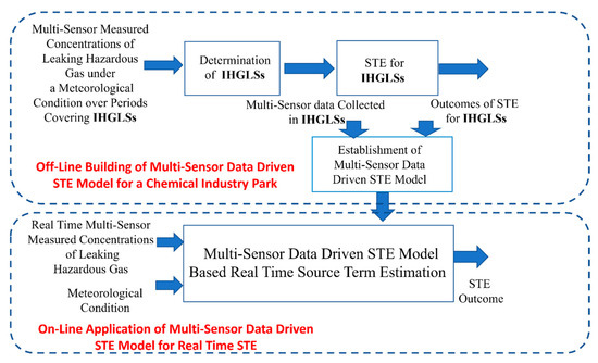 The IHGLSs are a new concept introduced in the present study, which refers to the hazardous-gas-leakage scenarios in a chemical industry park that are linearly independent. The building of the offline multi-sensor data-based STE model basically requires the completion of three tasks. First, advanced multi-sensor data analysis is applied to (1) find the number of IHGLSs over the period when the historical multi-sensor data are collected from the chemical industry park and (2) determine the most-representative multi-sensor data measurements for each of these IHGLSs. Secondly, a STE approach is applied offline to determine the parameters of the sources of leakages associated with each of these IHGLSs from the corresponding multi-sensor data measurements. Finally, the results obtained in the first two steps are used to produce a multi-sensor data-driven STE model that can be applied in real time to perform STE from multi-sensor data measured in the chemical industry park at any time. Because the STE in the second task is conducted offline, any existing approach can be applied as needed without any concern regarding time constraints. The well-known difficulties with the ATD-model-based-STE methods can therefore be resolved. In addition, because the multi-sensor data-driven STE modeling involves no supervised learning, the issues of possible poor robustness with machine-learning-based STEs can also be circumvented. Consequently, the new approach can potentially overcome many problems with the existing methods and enable STE to be literally applied in engineering practice.