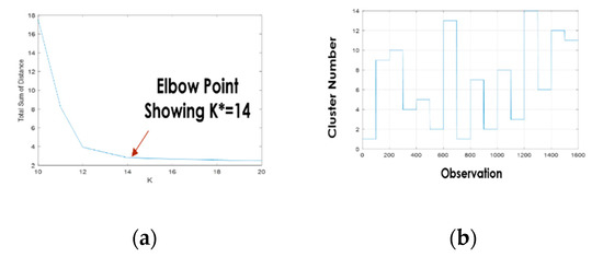 Step 1: Applying K-mean clustering to the M = 1600 measurements from the N = 10 sensors has results shown in Figure 4, indicating that the observed multi-sensor data have clusters. In addition, it can also be found from Figure 4 that Observations , i = 0, 1, …, 15 are within the same cluster; Observations 1–100 and 701–800 are in Cluster 1; and Observations 401–500 and 901–1000 are in Cluster 2. Obviously, these results are consistent to the true situation shown in Table 2. The average concentration in each of the 14 clusters, that is, the components in matrix , is obtained and shown in Table 3.