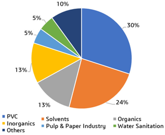 Cl2 is an important raw material for different types of industries. The end-use sectors for Cl2 include chemicals, textile, water treatment, pharmaceuticals, paints, plastics, and PVC industries (Figure 1) [6] and the world production crossed 75 MMT in 2019. In 2020, the global market capture of Cl2 was US$ 33.5 billion, with a CAGR of 4.5% in the forecasted period of 2022–2027 [7]. Canada, the USA, Japan, and France dominate the global supply chain of Cl2.