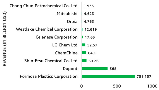 East Asia and the United States were the leading PVC suppliers over the last decade. In recent years, China has become the largest consumer and producer of PVC. China has transitioned from a net importer to a net exporter of PVC, surpassing the United States in both capacity and volume of PVC manufacturing [11]. In terms of revenues, ChemChina is the largest PVC manufacturing company in the world with a revenue of USD 46.5 billions/y. Whereas the two largest producers in terms of annual production capacity are Zhongtai Chemical Co., Ltd., Urumqi, China (with a production capacity of 2.2 million tons/y) and Xinjiang Tianye Co., Ltd., Shihezi, China (with a production capacity of 1.2 million tons/y) [11]. In China, either calcium carbide or ethylene-based PVC production is followed. However, 80% of PVC production in China is based on calcium carbide. The PVC resin manufactured with the calcium carbide technique is utilized in the construction of low-end pipes [12]. While PVC resin produced by the ethylene-based technique has minimal vinyl chloride residue and is utilized to produce refined high-end PVC items, which is not possible with the calcium carbide method. In the USA, Dupont (Dow Chemical, Midland, MI, USA) is the leading PVC manufacturer, followed by Westlake Chemical Corporation, Houston, TX, USA and Axiall, Atlanta, GA, USA. Other than the Chinese and American PVC manufacturers, Taiwan-based Formosa Plastics Corporation, Kaohsiung, Taiwan, South Korea-based LG Chem Ltd., Seoul, Korea, Japan-based Shin-Etsu Chemical Co., Ltd., Tokyo, Japan and Mexico-based Orbia, Mexico City, Mexico are the leading suppliers of PVC in the world market (Figure 2) [13].