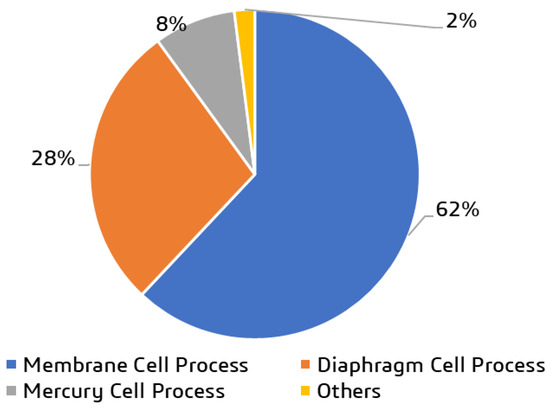 The chlor-alkali process is an industrial process for the production of caustic soda (NaOH) and chlorine (Cl2) by the electrolysis of brine solutions [19]. From the days of the diaphragm process (Griesheim cell, 1885) and mercury process (Castner-Kellner cell, 1892) to the contemporary membrane cell process (1970), the chlor-alkali process has come a long way, with a significant reduction in power consumption and CO2 emissions [5]. These processes differ in terms of electrode (anode and cathode) reactions and the techniques of product separation [20]. In most of the modern chlor-alkali processes (62%), the membrane cell technique has been utilized (Figure 3).