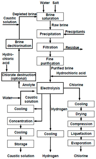 The chlor-alkali process can be broken down into three primary stages: (i) the first stage involves the preparation and treatment of brine; (ii) the second stage involves electrolysis; and (iii) the final stage involves product recovery [25] (Figure 4).