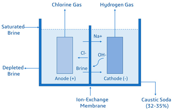 Before being employed in a cell operation, brine must first be purified according to membrane cell technology standards. Precipitation with OH− and CO3− removes the hardness and heavy metals. Acidification is the last step in the brine preparation process where microfiltration and nanofiltration, two types of membrane technology, are both employed [24]. For microfiltration and nanofiltration polytetrafluoroethylene (PTFE) membranes and polymer nanofiltration membranes are used, respectively [27]. In the electrolysis process, a chloride salt solution (e.g., NaCl) is decomposed electrolytically by passing a direct current through it. There are three basic processes for the electrolytic production of chlorine: the diaphragm cell process, the mercury cell process, and the membrane cell process (ion-exchange membranes).