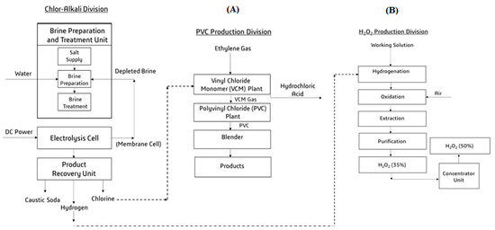 Combined Process Flow Diagram of Chlor-Alkali Process and PVC Processing Using Chlorine (A) and Integration of Chlor-Alkali Process and H2O2 production Unit (B).
