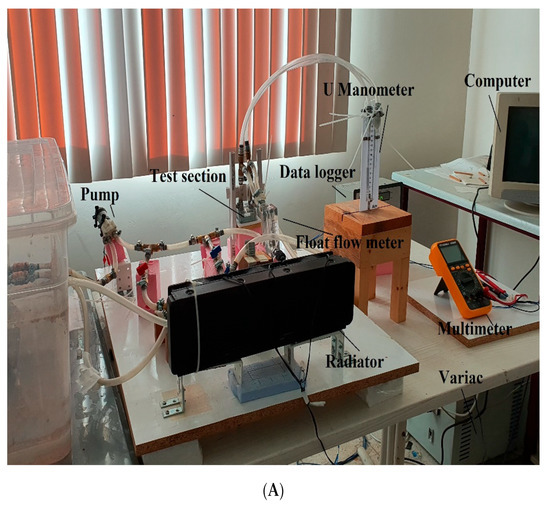The experimental setup consisted of a water block which is currently used in electronic cooling systems, a liquid tank, a pump, a by-pass line, a manometer, and a float flowmeter. A 12 V liquid pump was used to circulate the fluid. The flow rate was measured with a float flowmeter with a measuring range of 100–1000 mL/min, pressure was measured with a U manometer, and the temperature values were measured with 30-gauge copper-constantan T-type thermocouples and thermometers. All thermocouples that were used in the experiments were separately calibrated. The signals that were received from the thermocouples were processed with a data acquisition system and the temperature values were read from a PC computer. A variac (variable transformer) with 0–250 V range, was used to adjust the heater’s voltage and a TT Technic VC-9808+ multimeter was used to measure the voltage value. The float flowmeter and by-pass line were used to adjust the volumetric flow rate of the fluid.