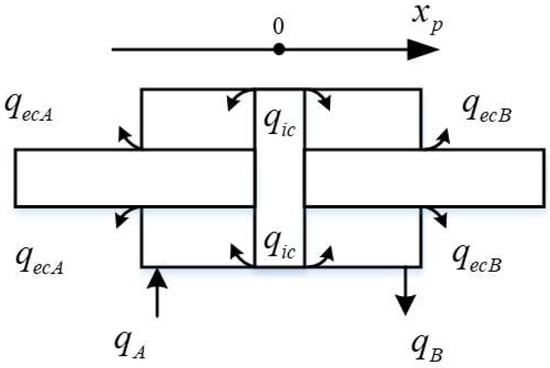Considering load conditions, oil compression, internal and external leakage, and other factors, the flow distribution characteristics of the hydraulic cylinder were analyzed as shown in Figure 3.