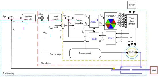 In this paper, the position control of the electro-hydraulic servo pump control system adopts three closed-loop control schemes, including the position loop, servo motor speed loop, and current loop, from outside to inside, as shown in Figure 4.