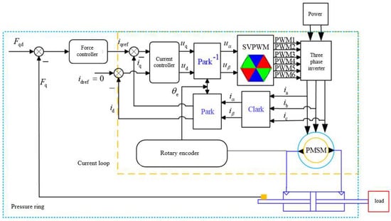 When the system performs force control, the servo motor controls the torque directly through the current loop, using the torque direct drive control scheme by adjusting the current input to change the hydraulic torque, and finally causing the pressure in the hydraulic cylinder load chamber to change, thus achieving high performance control of the system pressure. The system is successively composed of a system pressure loop and a current loop, from outside to inside, forming a double loop control structure, as shown in Figure 5.