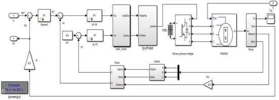 Based on the working principle and mathematical model of the servo motor, the servo motor vector control block diagram given in Figure 4 is transformed, and the servo motor simulation model is built in the MATLAB/Simulink environment, as shown in Figure 7. In the figure, * represents the expected value.
