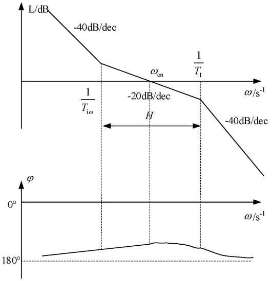 Defining H as the width of the mid-frequency band (slope of the curve is −20 dB/dec). According to the minimum resonance peak method of a second-order system, the relation between controller parameters and H can be obtained: