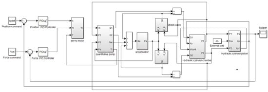 PID controllers have been widely used in electro-hydraulic servo control systems due to their simple structure and strong robustness. Therefore, in order to verify the rationality and correctness of the mechanism model and the simulation model of the electro-hydraulic servo pump control system established in this paper, a PID controller was adopted. The parameters of the PID controller were adjusted by the trial-and-error method. Finally, the PID controller gain P of the position control system is 52.5, the gain I is 5, and the gain D is 0; the gain P of the PID controller of the force control system is 43, the gain I is 3, and the gain D is 0.