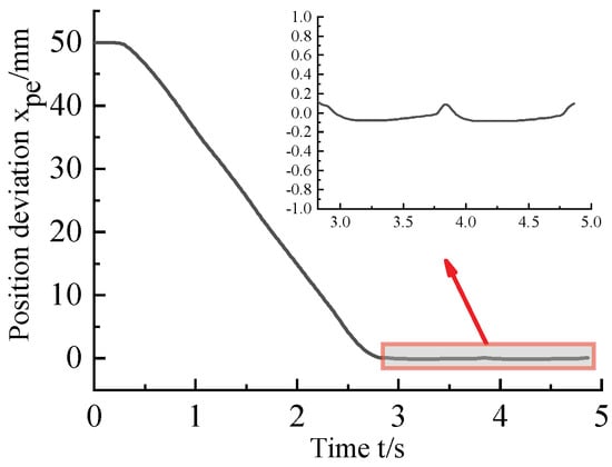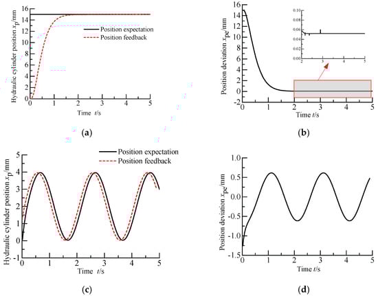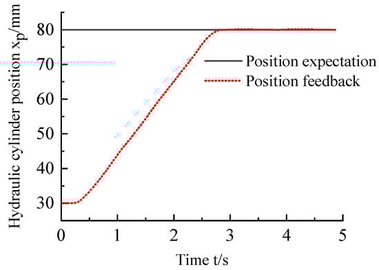 It can be seen from the above two figures that when the desired position command is 30–80 mm, the displacement of the hydraulic cylinder can basically follow the desired position command in the dynamic response. After 2.8 s, the position of the hydraulic cylinder reaches a steady state, and the steady-state error of the position is about ±0.1 mm.