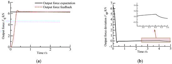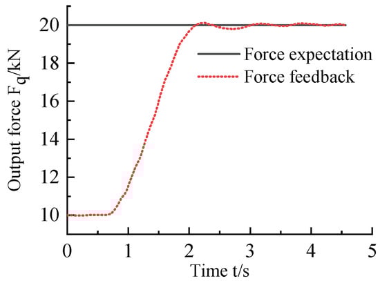 It can be seen from the above two figures that when the current expected force command is 10–20 kN, the output force of the hydraulic cylinder can basically follow the expected force command in the dynamic response. After 3 s, the output of the hydraulic cylinder reaches a steady state, and the steady-state error of the output force is about ±0.2 kN.
