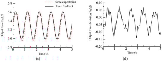 It can be seen from Figure 17 that the output force of the hydraulic cylinder can basically follow the expected force command. When the expected force command is 0–6.28 kN step, the output force of the hydraulic cylinder has a certain overshoot, the output reaches steady state after 2.5 s, and the steady-state error of output force is about ±0.1 kN. When the expected position command is ±0.3 kN @ 1 Hz sine, the force output follows a certain amplitude attenuation. The error of dynamic following force is ±0.15 kN.