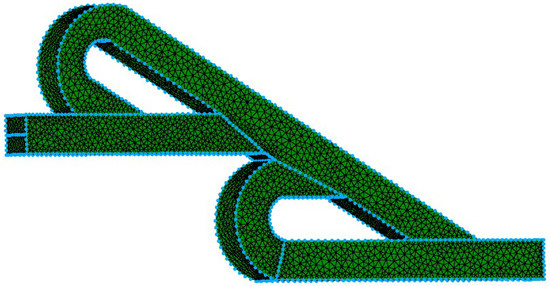 The OpenFoam platform is used for the calculation of the flow field and the uncoupled equations of particle motion [33,34]. The simulation process reads as follow: initially, the fluid flow is found using the incompressible Navier–Stokes equations and the pressure correction method. Upon finding the flow field, pressure, and velocity, the motion of particles is evaluated by the Lagrangian method. The equations are evolved in time by Euler’s time marching method. An unstructured computational grid composed of 96,881 (tetrahedra) cells was used here, as shown in Figure 2, which is adequate for the low Reynolds number of the flow. However, the selectivity of the mesh based on the importance of geometric and operating parameters was assessed to obtain a significant number of computational predictions in a reasonable time without compromising the validity of the results [19].