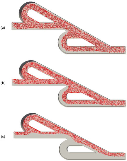 Simulations were divided into two main parts, which were the evaluation of the velocity and pressure field, and the particle distribution into the micromixer. Initially, from the variance in the fluids, a cross-section of the microchannel parallel to the flow direction [37] was evaluated for Vp/Vc = 20, Vp/Vc = 10, and Vp/Vc = 1. Under higher velocity ratios, the velocity field decreases inside the duct, which arises from the comparison of the selected velocity ratios. This decrease is not proportional to the increase in the velocity ratio. The rate of nanoparticles remained constant for the entire simulations. Part of the present results are visualized in Figure 3. From simulation results shown in Figure 3a–c, the inlet rate was equal to 1000 Fe3O4 nanoparticles per second in the upper half inlet of the micromixer. Hence, the only difference between 3a, 3b, and 3c is the inlet velocity ratio. Under Vp/Vc = 20 (3a) and Vp/Vc = 10 (3b), the distribution is satisfied, as observed from the beginning of the micromixer. In the first loop (upper part of the micromixer), the distribution of the nanoparticles is uniform, whereas in the second loop (lower part of the micromixer), the distribution is not satisfied. Near the common outlet, a very satisfying distribution is observed. It should be noted that, in the present simulations, only two Tesla valves were used in series compared to previous works, as shown in Table 1. However, under Vp/Vc = 1 (3c), no mixing was observed inside the whole length of the micromixer. Moreover, the results were almost identical when the inlet rates of Fe3O4 nanoparticles (diameter = 13.5 nm) were either 1000/s or 3000/s for both velocity ratios.