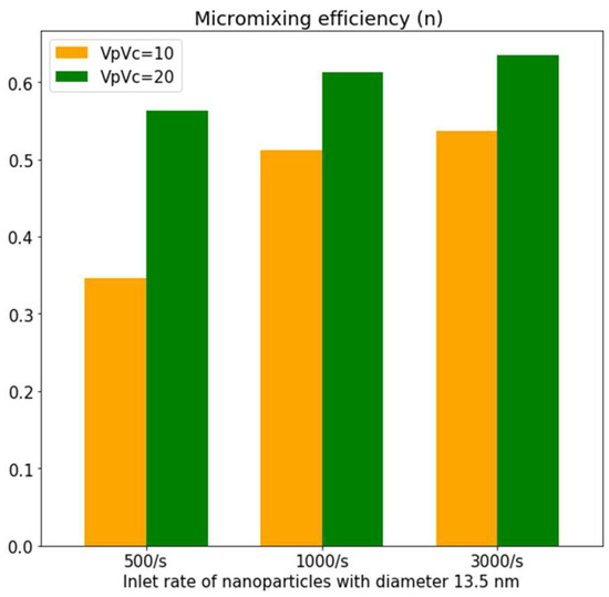 Mixing efficiency for Vp/Vc = 10 and Vp/Vc = 20 under inlet rates equal to 500, 1000, and 3000 nanoparticles per second.