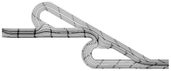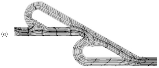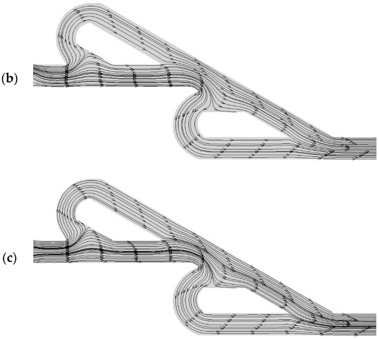 The streamlines of the duct are presented in Figure 5 under all the selected velocity ratios. In Figure 5a, the streamlines are visualized for a velocity ratio equal to Vp/Vc = 20, where streamlines are curved before the first loop due to the high velocity difference between the two inlets. Hence, the mixing is strongly dependent on the velocity ratio and no recirculation occurs near the duct entrance. As the velocity ratio is decreased to Vp/Vc = 10 (Figure 5b), the above phenomenon is less intense. Moreover, when the velocity of both streams is equal (Figure 5c), the phenomenon does not appear, and thus no mixing is achieved, as also shown in Figure 3c.