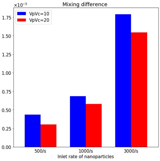 Mixing differences between different diameters of nanoparticles under inlet velocity ratios Vp/Vc = 10 and Vp/Vc = 20 and inlet rates equal to 500, 1000, and 3000 nanoparticles per second.