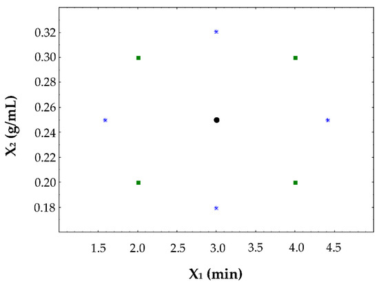A two-factor standard CCD was performed to optimize the effect of extraction time (X1) and solid-solvent ratio (X2) on the extraction of polyphenols from sweet cherries pulp. Twelve randomized experiments were conducted, consisting of four cube points, four star points, and four replicates at the center values to evaluate the pure error sum of squares and lack of fit test (Figure 1).