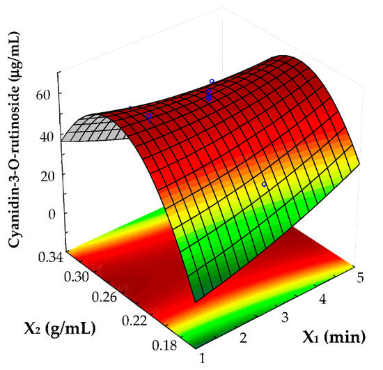 Response surface plots showing the effects of extraction time (X1) vs. solid-solvent ratio (X2) on polyphenols recovery from cherries pulp by UAE. Blue points retrace the CCD features.