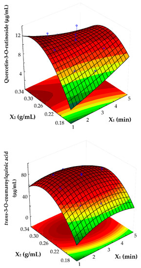 With regards to the X1 factor, its linear and quadratic terms were significant just in the case of trans-3-O-coumaroylquinic acid, whose amount initially increased upon the raise of extraction time and reached a maximum level (at around 3 min), after which it started to decrease (Figure 3). Again, the fact that the phenolic compounds rapidly transfer to the extraction solvent makes our method more economical than the methods developed for sour cherry phenols (100 min) [25] and sweet cherry anthocyanins (90 min) [18].