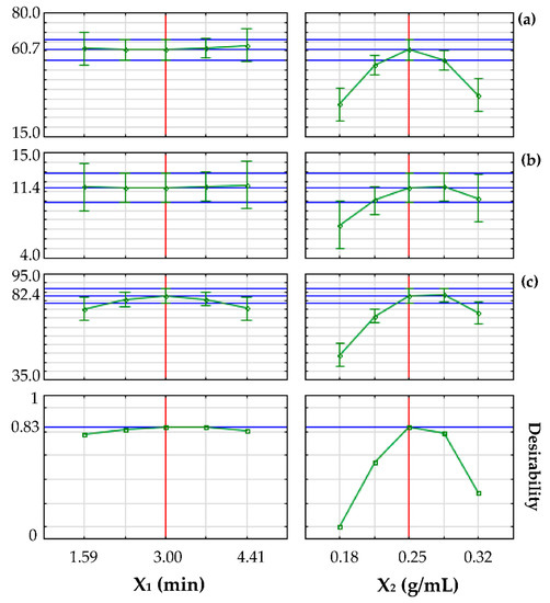 Desirability profiles of (a) cyanidin-3-O-rutinoside, (b) quercetin-3-O-rutinoside, and (c) trans-3-O-coumaroylquinic acid concentrations (μg/mL) in the extracts for each independent variable (X1 and X2). Blue and green lines indicate predicted and experimental value, respectively, while red lines indicate the best extraction conditions.