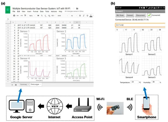 Data transmission by transmitting raw data from multiple sensors over Wi-Fi. (a) Data transfer over a Wi-Fi access point that is connected to the Internet. In this instance, the sensor data is recorded in a Google Spreadsheet file and displayed as graphs. (b) Data transmission via a BLE to an Android application that creates graphs of the sensor data in real-time.